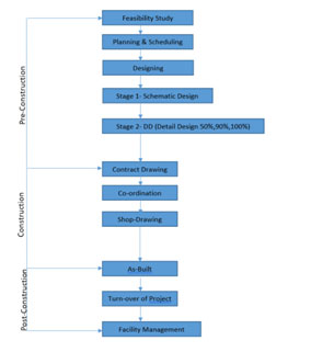 Post – Construction- This phase includes the turnover of projects ( TOP ) of documents and drawings and involvement of facility management ( FM ).
